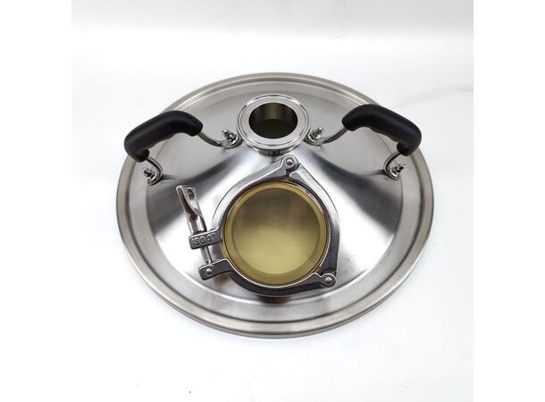 Dette er et kraftig lokk med 4″ Tri-Clamp åpning i midten, samt en 3″ åpning på siden med sikteglass.